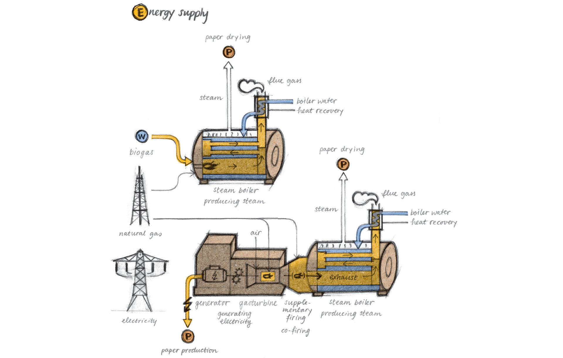 Smurfit Kappa Roermond Paper maakt papier dat de basis vormt voor golfkarton en verpakkingen. Om bezoekers te informeren over de fabrieksprocessen, werden die op een begrijpelijke manier getekend.